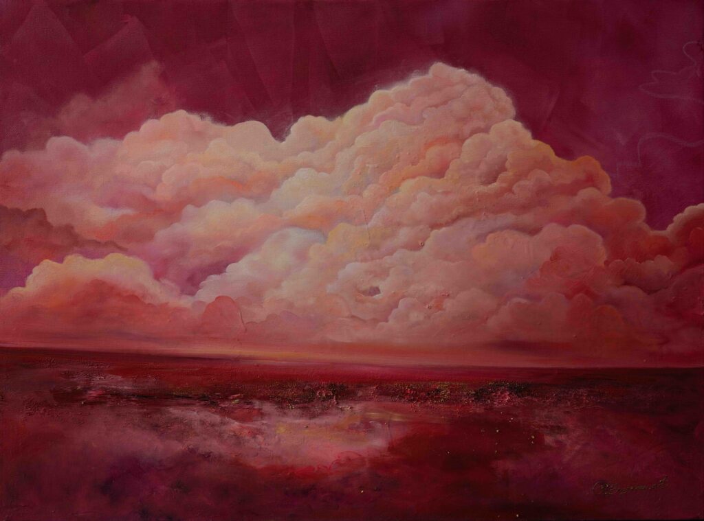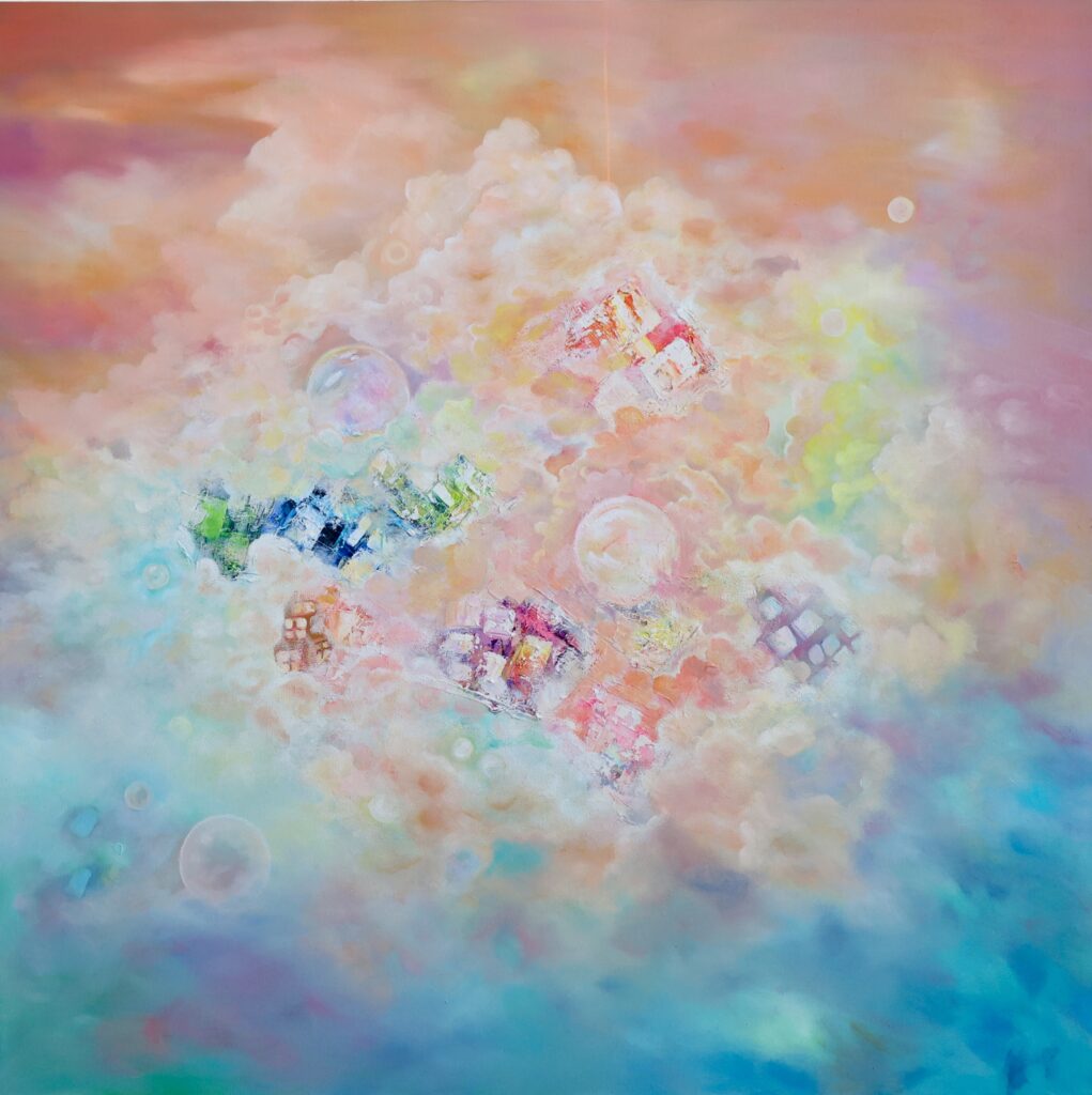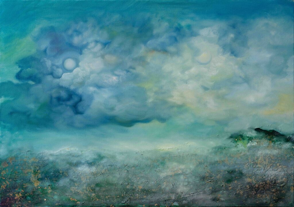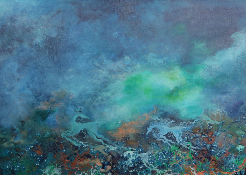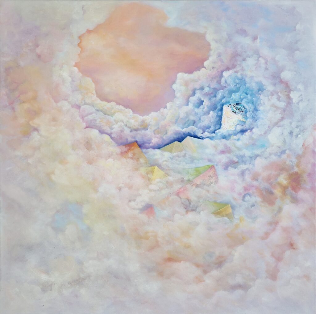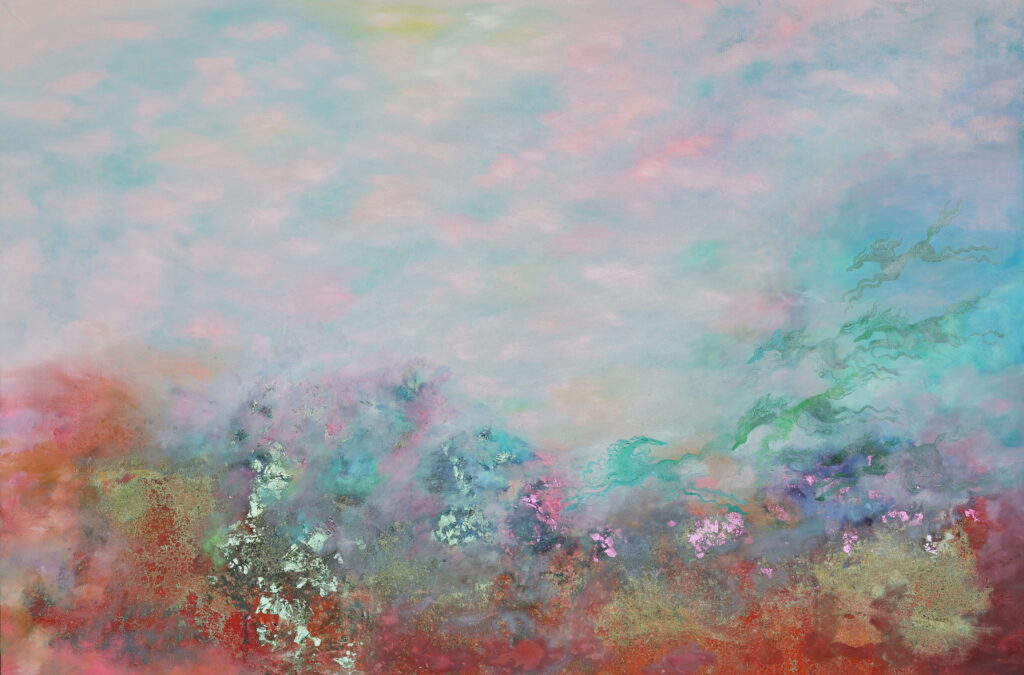 In her work, color becomes an inner language formed through layered material surfaces. Built with oil paint and mixed media, the accumulated layers create a quiet density that holds light and establishes a subtle center within the space. Clouds and mist appear not as direct depictions of nature, but as visual structures suggesting states of being. Rather than appearing as the literal image of a horse, Khiimori emerges through currents that traverse the canvas, condensed centers of color, and compositions that move between horizontality and ascent.