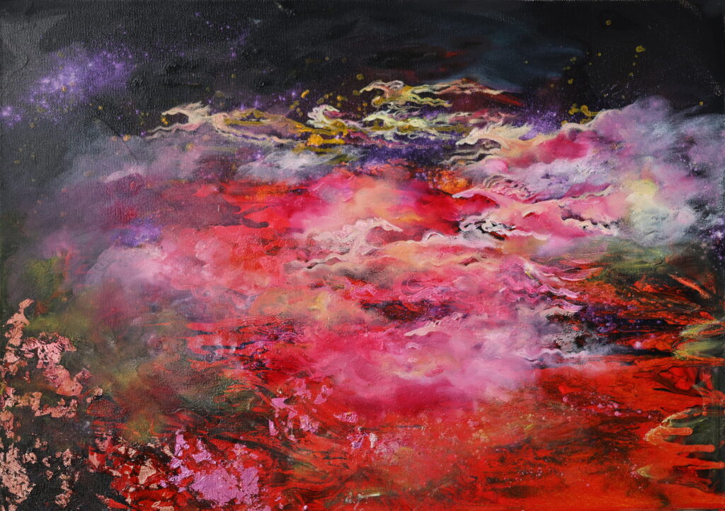 The expansive spirit of the Mongolian landscape is condensed into resonant layers of color, inviting viewers to reflect on their own inner energy and sense of direction.