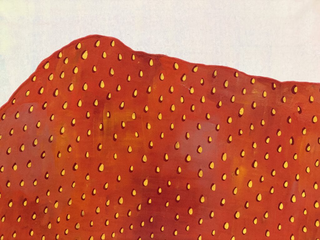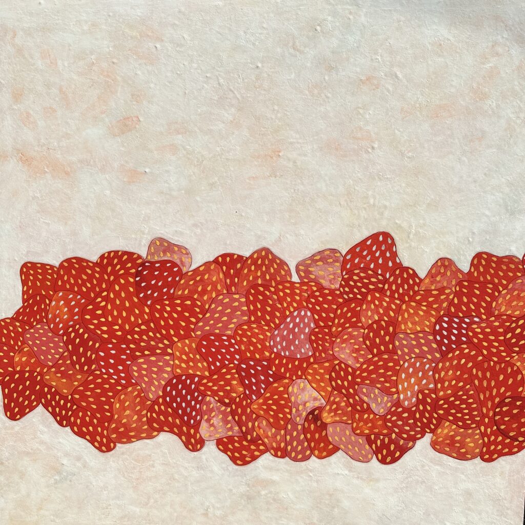 Set upon this luminous ground, the strawberries originate from the artist’s most intimate narratives. Within the structure of family, where love and stability coexist with tension and responsibility, KiKi Lin does not evade these layered emotions. Instead, she records them through the accumulation of repeated dots. These dots function as traces of labor and units of emotion, creating a rhythm that organizes scatteredsensations andrestores balance.