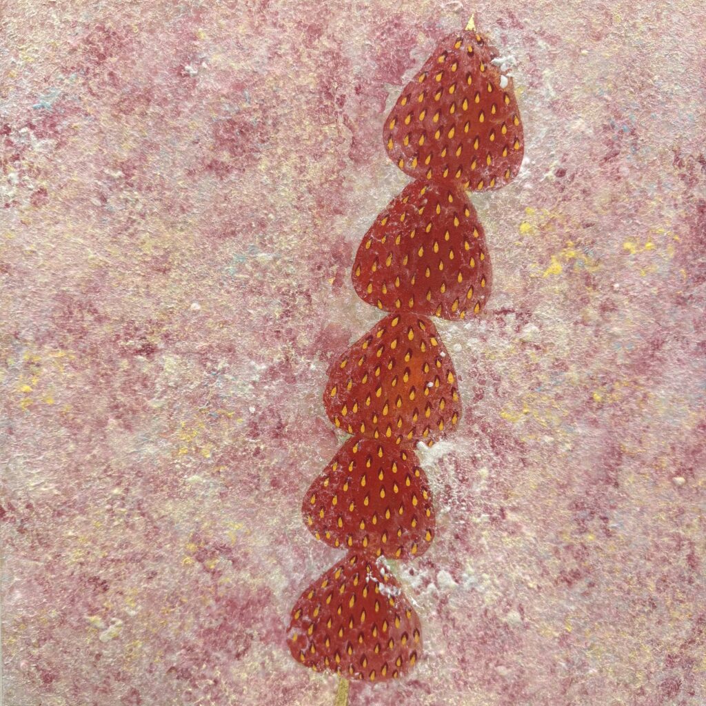 KiKi Lin의 회화에서 딸기는 단순한 대상이 아니라, 나눔과 풍요, 그리고 관계 속에서 형성되는 보이지 않는 감정의 밀도를 상징한다. 빽빽하게 쌓인 점과 금박의 결은 설명할 수 없는 관계의 흐름을 드러내며, 익숙한 장면을 낯설고도깊이 있게 환기시킨다.